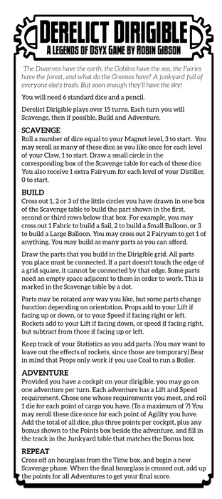 Legends of Dsyx: Derelict Dirigible is a solitaire roll-and-write adventure game in which players build an airship and use it to go on adventures. Each turn, the player rolls dice to scavenge resources; these resources can then be used to construct various airships parts. The parts are selected from a menu, all have different sizes and resource requirements, and must be connected in order to function, by being drawn by the player in a grid. Players must manage their resources and fuel to create a versatile airship, as adventures have specific lift and speed requirements in order to be successfully completed.
