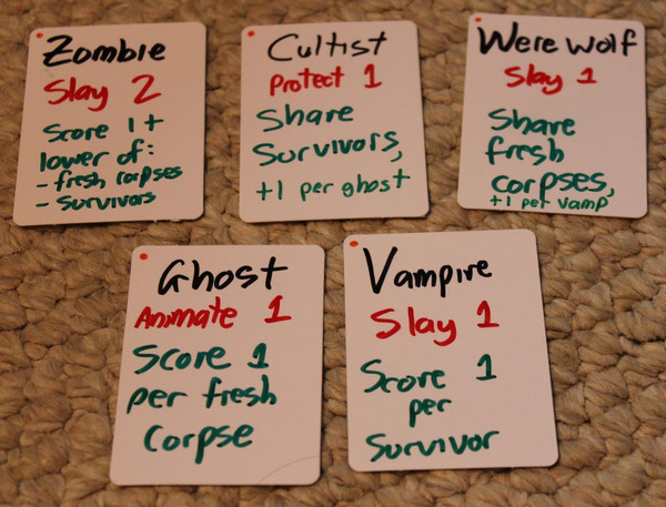 Players simultaneously select an undead role. Each role affects the village population in some way and score points according to the aggregate effect of all roles selected. When the village is wiped out, the game ends, and the player with the highest score wins.