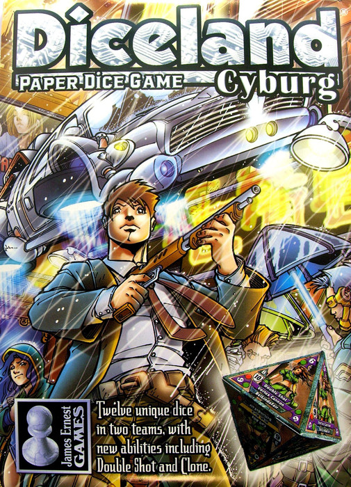 Diceland: Cyburg is the fifth installment in the Diceland series. Featuring artwork by Eduardo Müller (Deep White Sea). The cyber-space themed set contains 12 new unique dice and adds new abilities like clone, double shot, and entry points.