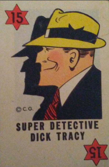 A trick-taking game based on the 'Dick Tracy' comic strip. The 35-card deck is divided into three "Gang" and three "Detective" suits, each of a different color. The Detective suits are numbered 1-5, while the Gang suits are numbered 1-6. There is also one card each of the Gang Boss and Dick Tracy, each worth 15 points.