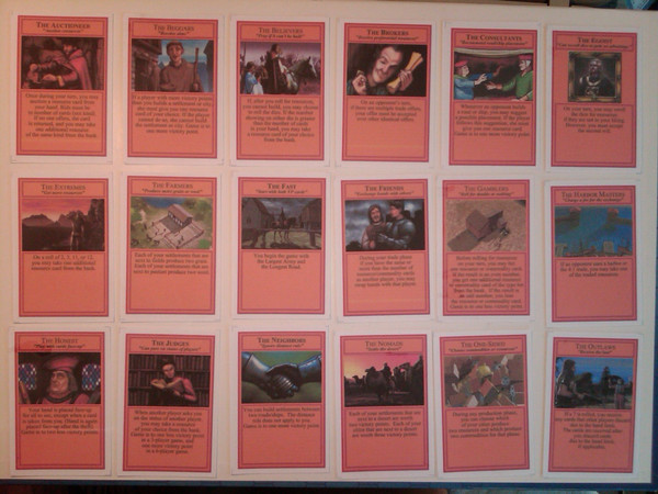Each player is given three random "Pioneers" cards before the game begins and chooses one to keep. The effects of the chosen card lasts throughout the entire game for the particular player who chose the card.
