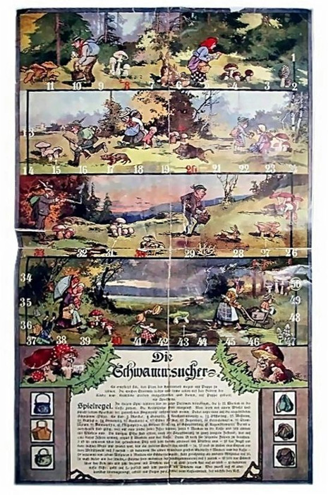 Up to six people can participate in this game, each paying 12 tokens into the till. You roll a die and move your piece according to the number of eyes thrown. Pay attention to the mushrooms shown. Those marked with + are poisonous; if you come up with such a (red) number, you pay 2 tokens into the register and pass one roll of the dice. The other mushrooms are edible, including the ink cap when very young; if you come up with one of these digits, you receive 2 tokens from the register.