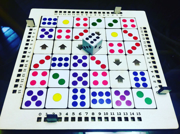 This lasercut game has a compact game board with four built-in scoring tracks, 36 numbered tiles and two dice.