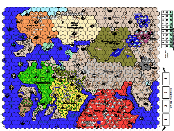 Starting in 1997, Glenn Rahman designed an extension to Divine Right. Scarlet Empire took place in a different period in that game's world, and further to the south of the original map. It was designed as a stand alone game that could also be played in combination with the other one. The campaign game pits most of the players against the one playing the Scarlet Witch King.