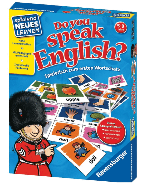 To make the first words in english very easy, children play the well-known games of lotto or memory or bingo and use 36 picture cards showing english words belonging to one of 9 groups: Family, animals, body, toys, at home, at school, food+drinks, clothes and seasons. Speaking and hearing in this game are very important so a grown-up who speaks English should be present during play.