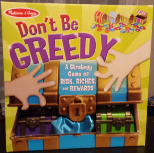 Push your luck game for kids by Melissa and Doug. Players take turns drawing jewels from a bag to put in their treasure chests. If they draw a frown they have to put their treasure back in the bag.