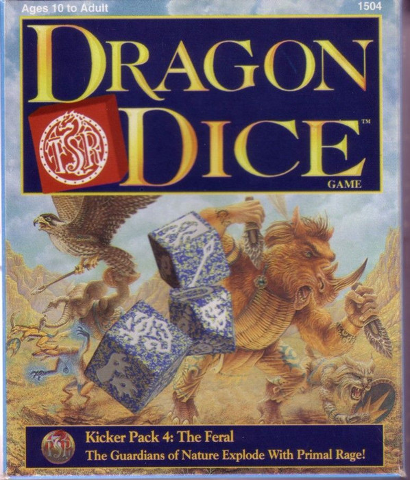 Includes 1 10-sided Elder (monster) die and 7 6-sided unit dice (4 small 16mm, 2 medium 18mm, and 1 large 20mm) of the blue and gold Feral.