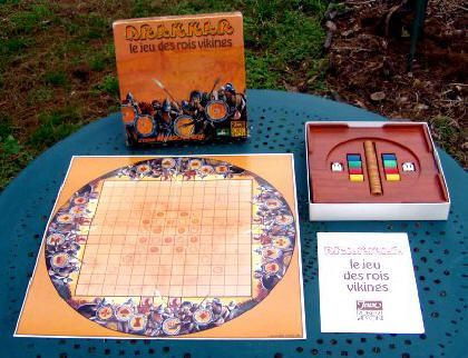Contents: a square board 13×13, 30 tokens with an emblem printed on a face (6 different emblems), 8 pawns, 2 dices.