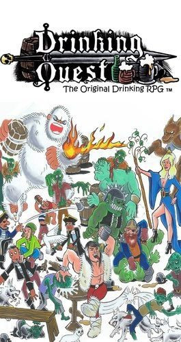 The battles are a series of one-on-one fights to the death. You either kill the monster earning coins and XP or your character dies and you must chug your drink! The cards act as the GM (So everyone can drink) and the heroes go through four themed quests in each game - each getting progressively difficult and more likely to drink. However as this is a light RPG and a light Drinking Game there is a one chug per quest maximum which prevents Drinking Quest from being a "Pass out in 10 minutes" kind of drinking game. Over the course of 2 or 3 hours, a typical game averages 2 or 3 chugs.
