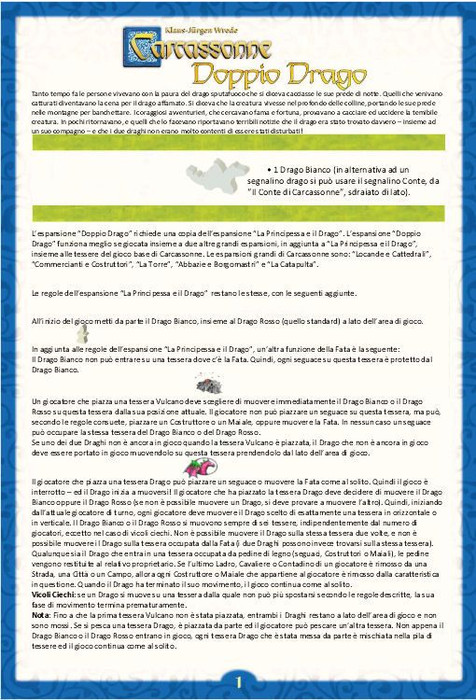 A new White Dragon is scaring Carcassonne. Play with 2 Dragons (a Red and a White one) that can both move and eat meeples during their path. The player who places the Dragon Tile decided which Dragon will move.