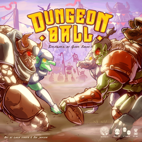 Dungeon Ball gives 1-2 players a fast-paced, arcade style experience as they try to outwit and outscore each other over the course of two halves of play. The player with the most points at the end wins. Games take around 45 minutes.