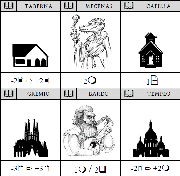 Also there is a Line of Events with 6 cards (quest and events representing), which you can choose to buy and each round the empty places in this row are filled from a deck of cards divided into 3 different "Ages" (the last two ages cost more gold coins).