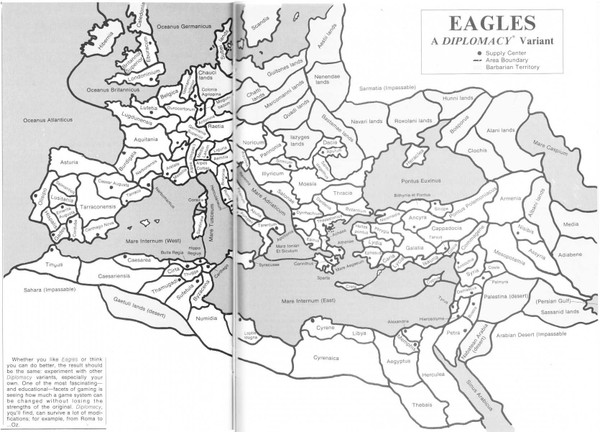 Eagles is a Diplomacy variant which is set in an alternate history Roman Empire; the game starts in Spring 118 CE shortly after the assassination of Hadrian. The game can accommodate 2-12 players but is recommended for 4-6.
