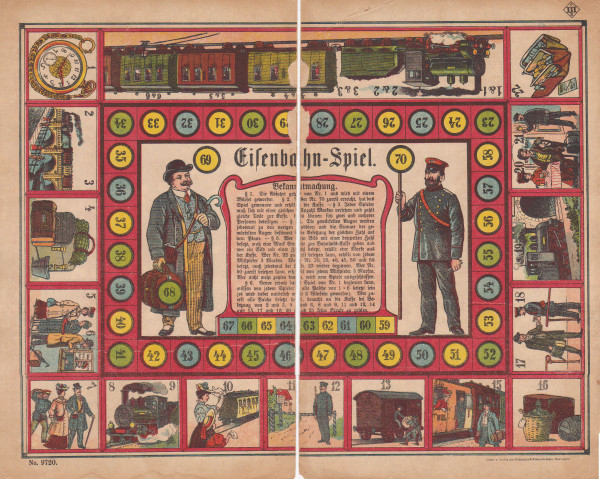 One of a number of German journey games inspired by the classic Game of the Goose, the Eisenbahn-Spiel has players competing to reach the final (70) location first. In a variant on the traditional Game of the Goose, players are required to roll doubles for each number before being permitted to start, movement is determined by a single die (as opposed to the two dice traditionally used), and landing on some spaces will incur fines, with players unable to pay being eliminated.