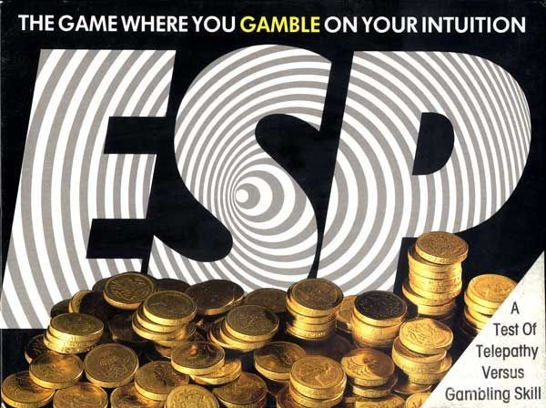 Using the symbols used in ESP tests, players have discs to secretly select a symbol, then bet on the collective outcome. You can bet on the color or shape and as the game progresses, you cash in your winnings, buying tokens to spell ESP to win.