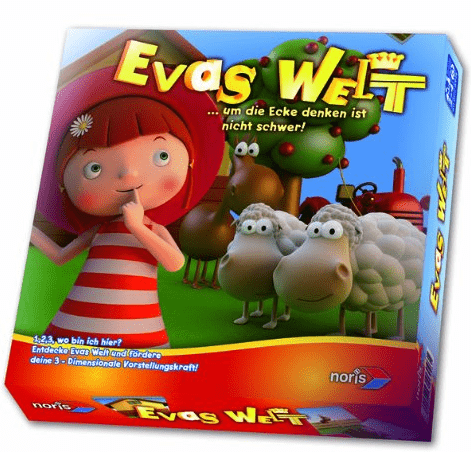 In Evas World there are buildings, a car, a tractor & trailer, a swimming pool, trees, a pasture and much, much more. All those things are pictured on 48 discovery cards, items are presented as seen from all possible directions. On the game board with 12 inner squares all those things are pictured when being looked on from above, as you would do from an airplane.