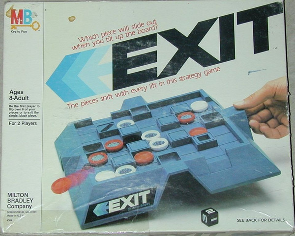 "In this fast-playing strategy game, shuttle your pieces around the maze-like gameboard and slide them out of the Exit Chutes by a mere tilting of the gameboard. A toss of the die determines just how many tilts you make, but you, alone, must decide which gameboard side to tilt...and that takes a lot of plotting and planning." The object is the be the first player to get all 6 of your playing pieces pattern-side-up on the gameboard or exit the single, black playing piece.
