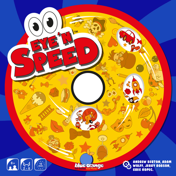 Spin to win in Eye 'N Seek! Each player has a double-sided spinner that has images on each side that are visible through three holes in the spinner. On a turn, you reveal one of the challenge cards, then everyone races to find the item or items on the appropriate side of the spinner. Whoever finds a match first wins the card, and whoever has collected the most cards when the 18-card deck runs out wins the game!