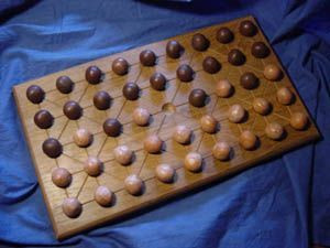 Fanorona is a classical two-person strategic abstract game that comes from the island of Madagascar and is still popular there today. It is played on a rectangular board made up of two Alquerque boards with 22 plain black and white pieces. Capturing is compulsory and a series of captures may be made by the same piece on a turn, as in checkers. Unique aspects of the game include its method of capture (either approaching or withdrawing your piece from a line of enemy pieces), and the "vela partie" (debt game) after winning a decisive game (the winner must let the loser "eat" one man each turn for 17 consecutive moves). Because of the density of the board (only one open spot at the games beginning) and the unique method of capture, strategy is complex and enigmatic, with fewer pieces often beating more pieces. (While very different, the game feels somewhat like Zertz due to the above.)