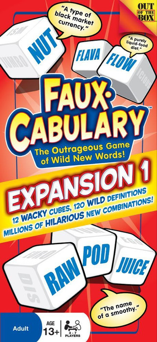 Faux•Cabulary: Expansion 1 includes fifteen new word cubes and sixty new cards (with 120 definitions) for use with the Faux•Cabulary base game.
