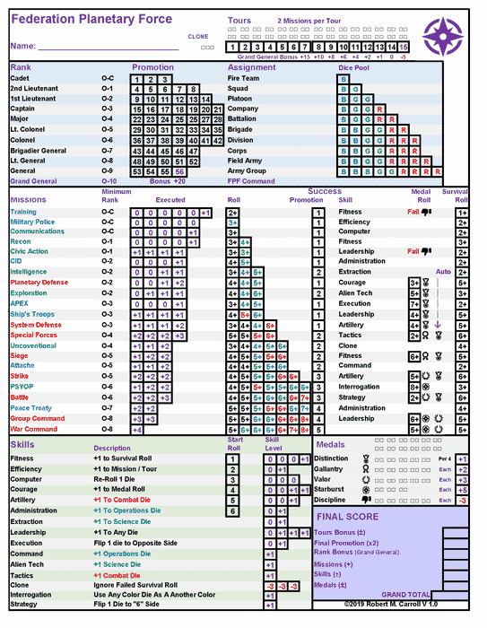 Who says the fly boys should have all the fun? We grunts, we happy few, live life hard and full. Do you have what it takes? Can you achieve the rank of Grand General before the bugged-eyed aliens call in your marker? All you need to do is advance 11 ranks, commanding 11 increasing assignments, while engaging in 22 different missions and acquiring up to 15 different skills. You also are eligible for decorations and commendations of the highest order. Sound like a lot to track? Nonsense! It is all contained on ONE page. You roll. You write. Hopefully, you get promoted . . . or at least live to fight another day . . . which for grunts, is all we ask. This follow-ups Federation Stellar Force and the next game in the One Page In A Life Series (OPIAL Series).