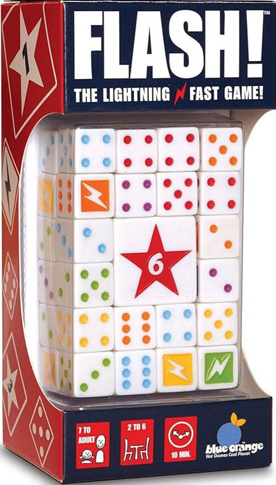 Watch the sparks fly in Flash!, a lightning-fast dice dash. Players race to complete eight challenges of dice combinations while racking up the most points. Best not blink as any player could score in a flash!