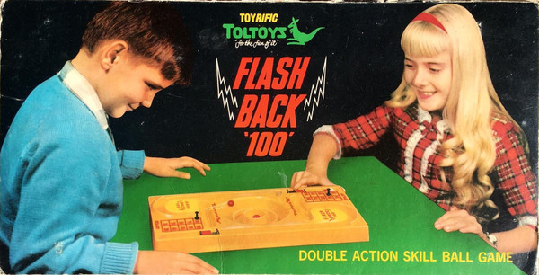 Simple game of skill for 2 people. Players takes turns of placing a marble in a slot against a plunger and catapulting the ball along a curved ski ramp where the ball becomes airborne. If the correct force is applied the marble lands in a concentric scoring zone marked 30,20 or 10 points.