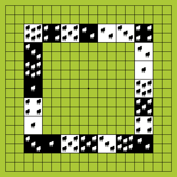 During the Dispersing phase, priority is given to moving sheep that have the most length of shared edges. The sheep must move to reduce the total length of connections, and the number of touching corners. The Dispersing phase ends when no sheep are touching each other.