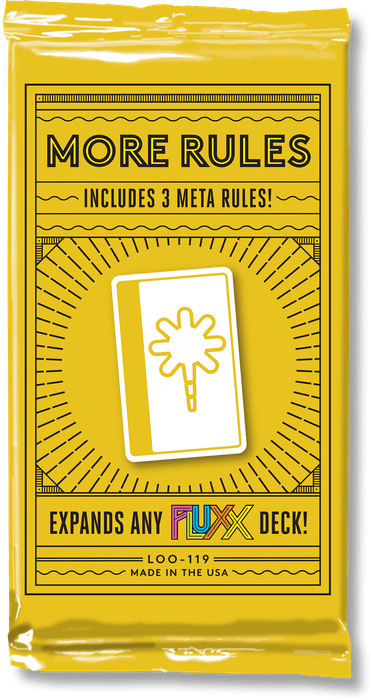 More Rules is an expansion pack for any standalone Fluxx game, with this pack containing ten new rules and three "meta rule" cards.