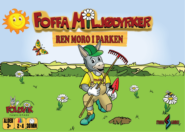 Foffa Miljødyrker is an easy family game for ages 5+. Players move around in Foldvik Familiepark (a Norwegian theme park) and help pick up litter. They gain tokens for throwing the trash in the correct bins, placed around the board.