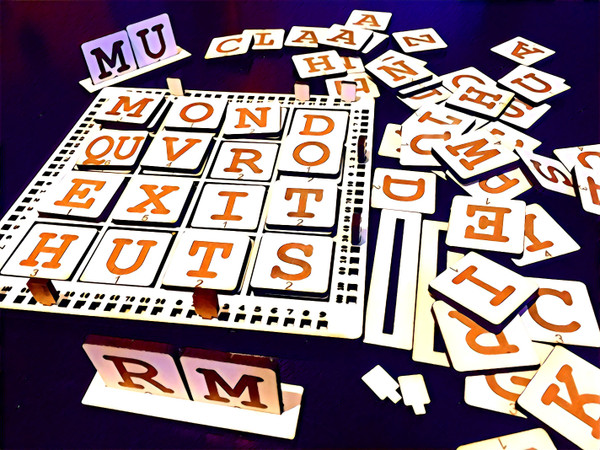 The Lasercut game consists of a six-inch game board and 100 single-letter tiles.