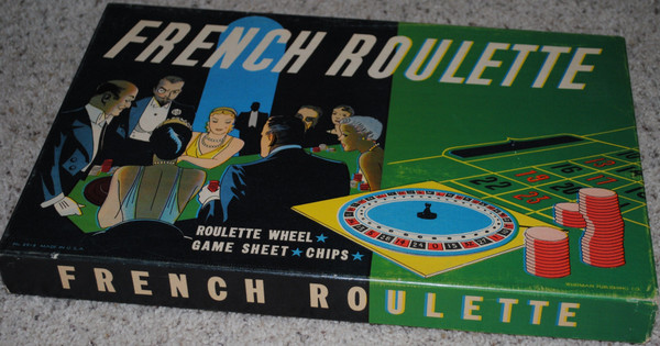 This game is played similar to Roulette. It includes a cardboard spinner with the standard black and red betting amounts and a paper playing mat with all of the spaces for placing your bets, using blue cardboard markers. The spinner does not use a ball. Instead there is a black line in the base which shows through a hole punched above each betting mark.