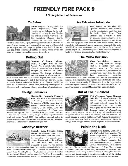 Friendly Fire Pack 9 contains eight scenarios featured in the Friendly Fire 2014 Advanced Squad Leader tournament. The scenarios are: