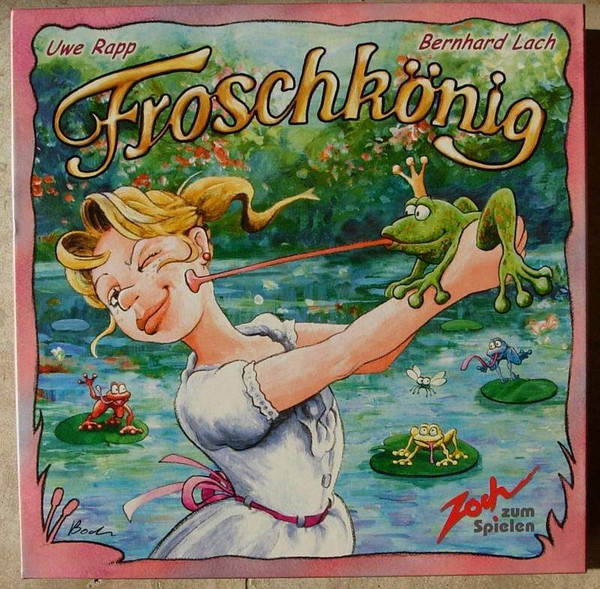 In Froschkönig (Frog King), players have a bag containing 18 wooden beams of different lengths. In a round, players search in through their bag, and by touch only, pull out two beams which added in length must be as near as possible from a given length shown on the board – but never longer than it. The winner for the round gets to place both beams as a part of their frog's tongue. The player who was second, gets to place the shorter of their two beams as part of their frog's tongue. The owner of the frog that first touches the princess, who is a couple of board lengths aways, with its tongue is transformed into the Frog King and wins the game.