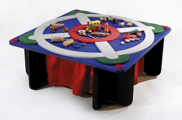 Large, colorful wooden box (50 x 50 x 20 cm) with 4 curtained holes to put your hand through