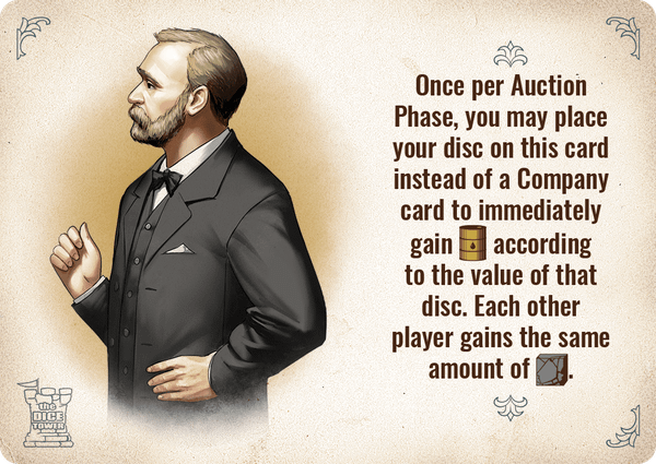 Card effect: Once per Auction Phase, you may place your disc on this card instead of a Company card to immediately gain oil according to the value of that disc. Each other player gains the same amount of coal.