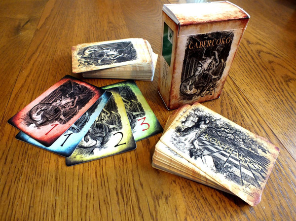The game contains standard Ace->10 cards and three different Jabberwocks in each color. The Jabberwock is a trump card that comes back in the hand of a player and immediately evoluate to a less powerful version of himself. Only another Jabberwock can beat him.