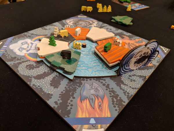 After rotating the Planet, choose one of the four corners of the board. The Sky Object printed there (Sun, Meteor, Rainbow, or Storm) will activate its ability on whichever location on the Planet has now been rotated beneath it. Life-forms are born under the Rainbow and the Sun, migrate out from under the Storm, and get blown up when the Meteor drops a Land Tile on them.