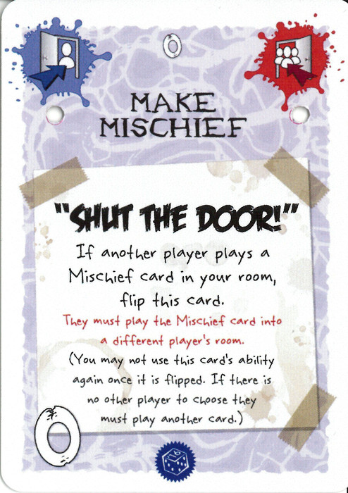 If another player plays a Mischief card in your room, flip this card. They must play the Mischief card into a different players' room. (you may not use this card's ability again once it is flipped. If there is no other player to choose they must play another card.)