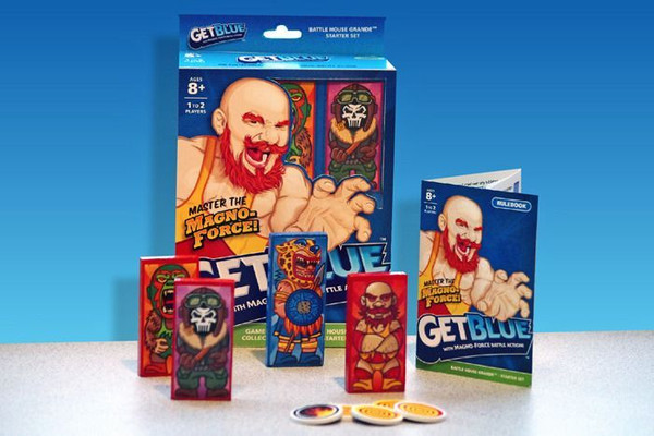 Get Blue is a kinetic, magnetic table-top game comprising of tiles and discs. A Starter Set has four tiles and five discs. Tiles have a magnet inside. Discs have a metal core. Players score points by spinning their discs, connecting to and knocking over a tile. If a disc connects to but does not knock over a tile, players loose points. The Red Tiles are worth one point. The Blue Tile is worth two points. The Flame Spinner is a double point disc. (Points are doubled if you capture or are reversed captured.)