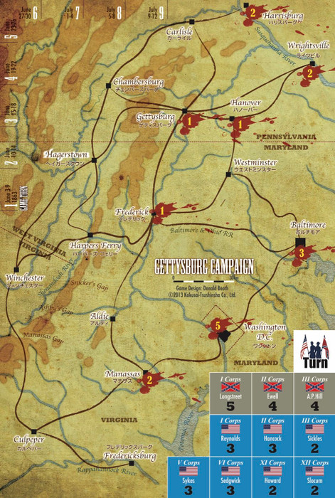 Operational level wargame for battle of Gettysburg in American Civil War. This game published first in external supplement for Command Magazine Japan edition #113, and later updated and web-published.