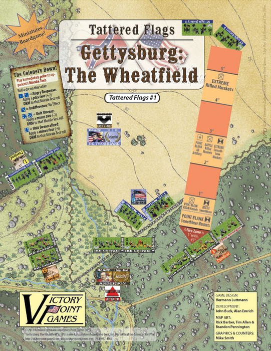 Tattered Flags is a series of Kriegspiel-style historical miniatures/board game depicting battles of the American Civil War (1861-1865). In this first game in the series, each player controls a Union or Confederate force at the Battle of Gettysburg, struggling for The Wheatfield on July 2nd, 1863. Gettysburg: The Wheatfield was carefully crafted to introduce players to system basics of organization, events, maneuver, fire and morale, with future games in this series promising to expand the detail and accuracy of the Tattered Flags system.