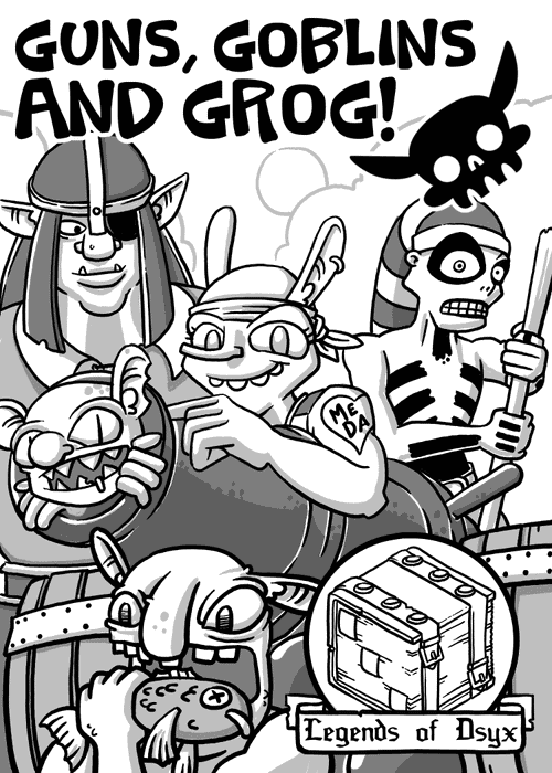 Goblins, Guns and Grog is a solitaire roll-and-write adventure game in which players attempt to navigate a treacherous sea route to make it to the mainland. Each turn, the player rolls dice to "Scavenge" (add items to the inventory), "Attack" (if in possession of cannons), "Loot" (in case of a successful attack), "Move" (along the map track, always straight forward towards the destination), "Adventure" (if the turn has ended on one of the X's scattered along the track). Every turn ends with eating, depleting the meager store of food that, if exhausted, causes the player to lose the game.