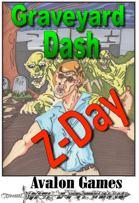 Graveyard Dash: Z-Day is the 100th game in the Bad Baby Productions Minigames Series and is a reimplementation to to the first game in the series, Graveyard Dash. In this game, up to three players are attempting to escape from a horde of zombies. There are rules for solitaire play as well. Players win by exiting their character pawn from the board to safety.