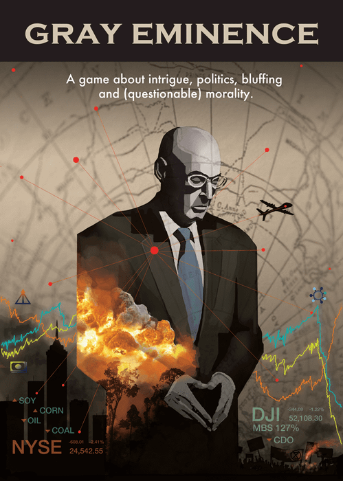 Gray Eminence is a 3-5 player game lasting 60-90 minutes, in which players take the roles of powerful puppet masters in the modern world, each working towards common goals as well as their own secret agenda. Each shadowy figure uses money, power and influence to steer the course of multiple factions toward their own inscrutable ends.