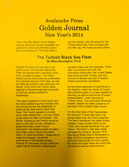 The New Year's 2014 Golden Journal includes 25 new laser-cut, mounted, scorchless and sootless pieces for the Turkish Black Sea Fleet: 15 "long" ship pieces, 9 square ones, and a seaplane. And we have some scenarios for them, too.