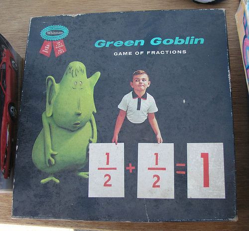 This is an educational children's game intended to teach them fractions. Players compete to correctly identify fractions and fraction calculations while avoiding the "Green Goblin." Game includes a variety of cards with fractions and partial fractions, pie charts, and a green goblin.