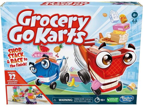 32 CONNECTABLE, COLLECTIBLE GROCERIES: As shoppers zoom around the board, they stack and connect their shopping list’s mini groceries in their kart. The first to hit Checkout with all their items wins