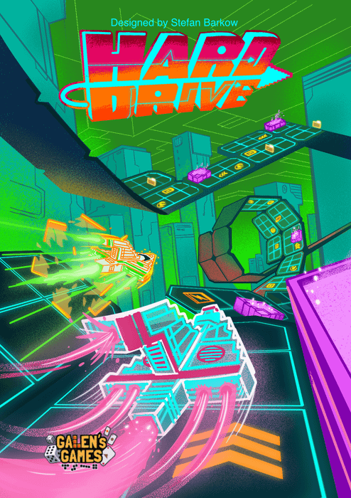 In Hard Drive, players roll a pool of dice, then use them to navigate an evolving race course. Collect charge to set up drift combos or change your die results, collect plug-ins to gain abilities that help you or hinder your opponent, cross overclock spaces to increase your speed, and use course mods to hack the system and pull off crazy maneuvers like rotating course cards.