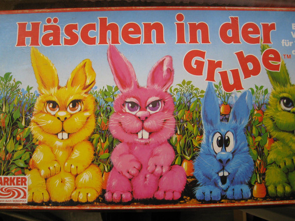 The rabbits eat delicious vegetables in the garden. In front of the garden fence they discover big carrots. In the middle of the garden there is a hole. Caution! Don't fall down there! First there is a thin chain that is laid around all players' pawns which are placed around that hole on the board. Each turn the player throws the die and moves as many fields to the outside as the die shows. When a rabbit reaches the chain it is pushed forward in an outside direction while opposite rabbits located in the opposite direction are pushed towards the hole and may fall into it when the thrown die shows enough eyes. The winner is the player who has at least one rabbit left at the end.